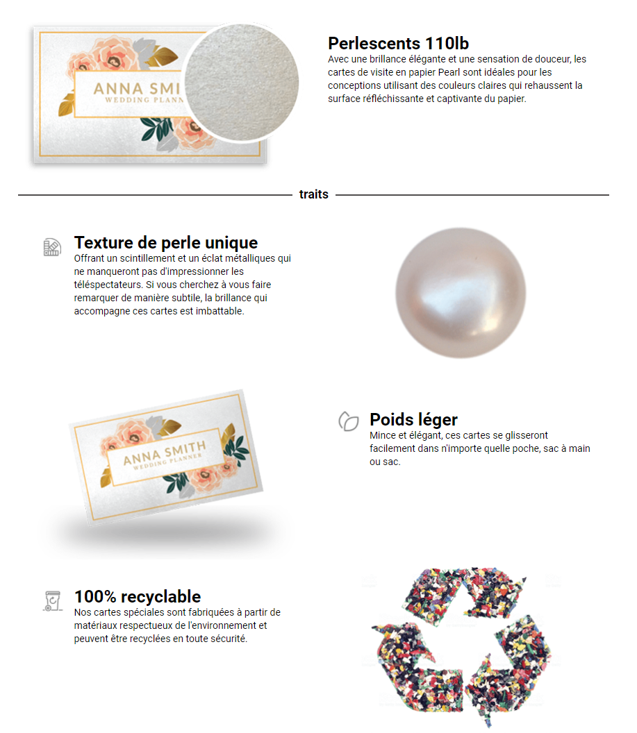 Un stock unique qui scintille sous différents angles, les cartes de visite en papier Pearl sont incrustées de fibres perlées qui donnent au papier un aspect lisse et métallique. Cela aidera également à donner aux couleurs plus claires de votre conception