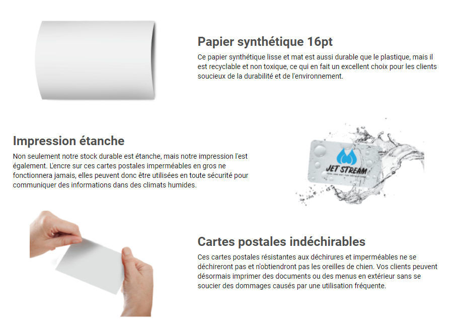 Les cartes postales imperméables fabriquées à partir de ce papier synthétique haut de gamme retiennent l'encre, qu'il pleuve ou qu'il fasse beau. Non toxiques, résistantes aux déchirures et 100% recyclables, ces cartes postales durables ne man