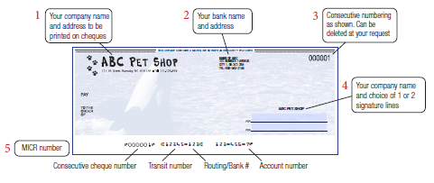 Inscrivez «ANNULÉ» sur l'un de vos chèques ou bordereaux de dépôt ou joignez une spécification MICR existante remplie par votre institution financière et indiquant le numéro et les informations d'acheminement à imprimer.