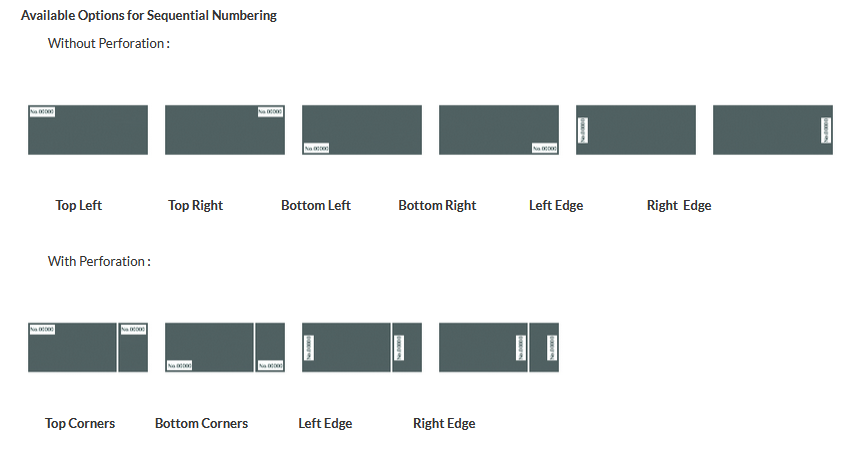 Les billets d'événement sont livrés avec des perforations facultatives et une numérotation séquentielle, imprimées sur notre format standard - 5,5 "x 2". Nous effectuons des perforations pour permettre une séparation facile de deux sections du matériau, permettant au papier d'être déchiré le long de la ligne. L'autre moitié des billets est conservée comme souvenir de l'événement. La numérotation séquentielle est importante pour suivre le décompte des effectifs et les rapports financiers.
