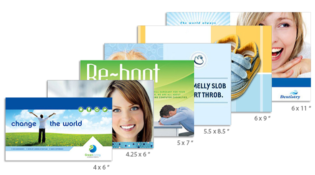 Tailles 3 "x 4", 4 "x 4", 4,25 "x 5,25" 4 "x 6", 3,5 "x 8,5", 5,5 "x 8,5", 4 "x 9", 6 "x 9" et 5 " Les dimensions x 7 "sont standard pour ce type de produit. Base, elle est disponible en impression recto verso (4/4) sur une carte de 12pt brillante ou mate.